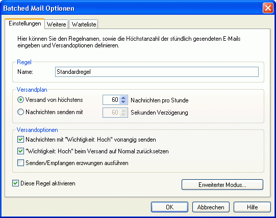 Nun müssen Sie in den Einstellungen von Batched Mail (Extras | MAPILab Toolbox | Batched Mail) die Option „Maximal 60 Nachrichten pro Stunde senden“ aktivieren.